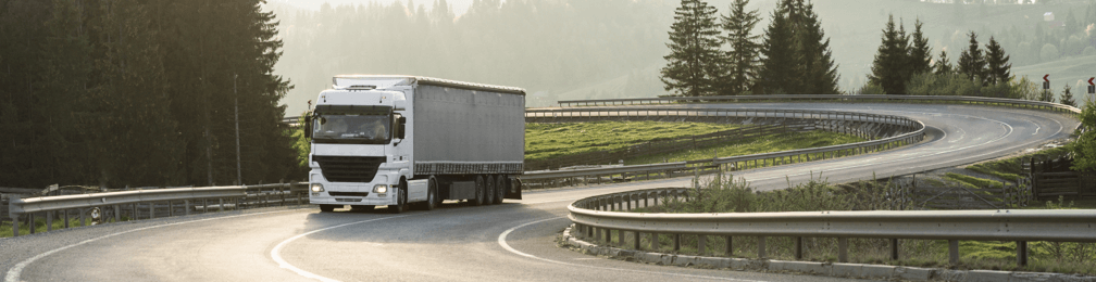 To zdjęcie przedstawia flotę używającą opon bieżnikowanych Bandag, do jazdy po autostradzie z pięknym krajobrazem w tle.